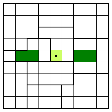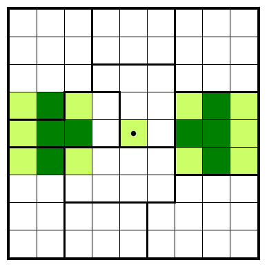The second ingredient involves overlaps between opposite areas. For example, looking at the top left and bottom right corner, the areas intersect in a 3×3 square (yellow). Both have the same number of shaded cells in this square, so we can deduce that the two pairs of light green cells have the same number of shaded cells, as well.
