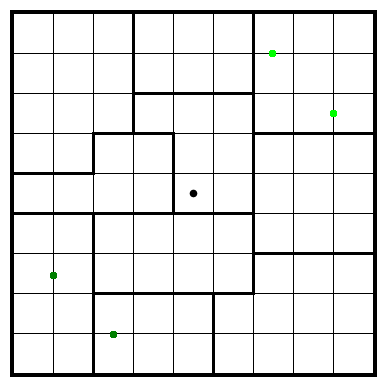 Around the bottom left and top right corner, we find a dot in the bottom two cells of column 3, mirrored to the top of column 7. By intersecting the bottom left and top right areas, we can deduce that the first two cells of row 6 get a dot, mirrored to the end for row 4.
