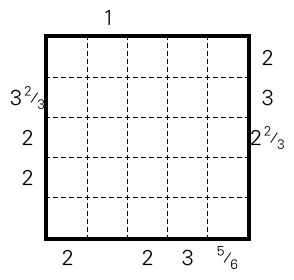 Rules Place some light sources and walls. Light sources go on grid vertices, but not on the border. Walls go on grid lines and must not touch light sources. Numbers outside the grid indicate how many light bulbs illuminate the adjacent edge in total, where a light bulb that illuminates the entire edge counts for 1 (regardless of distance), a light bulb that illuminates the edge partially counts for the corresponding fraction.