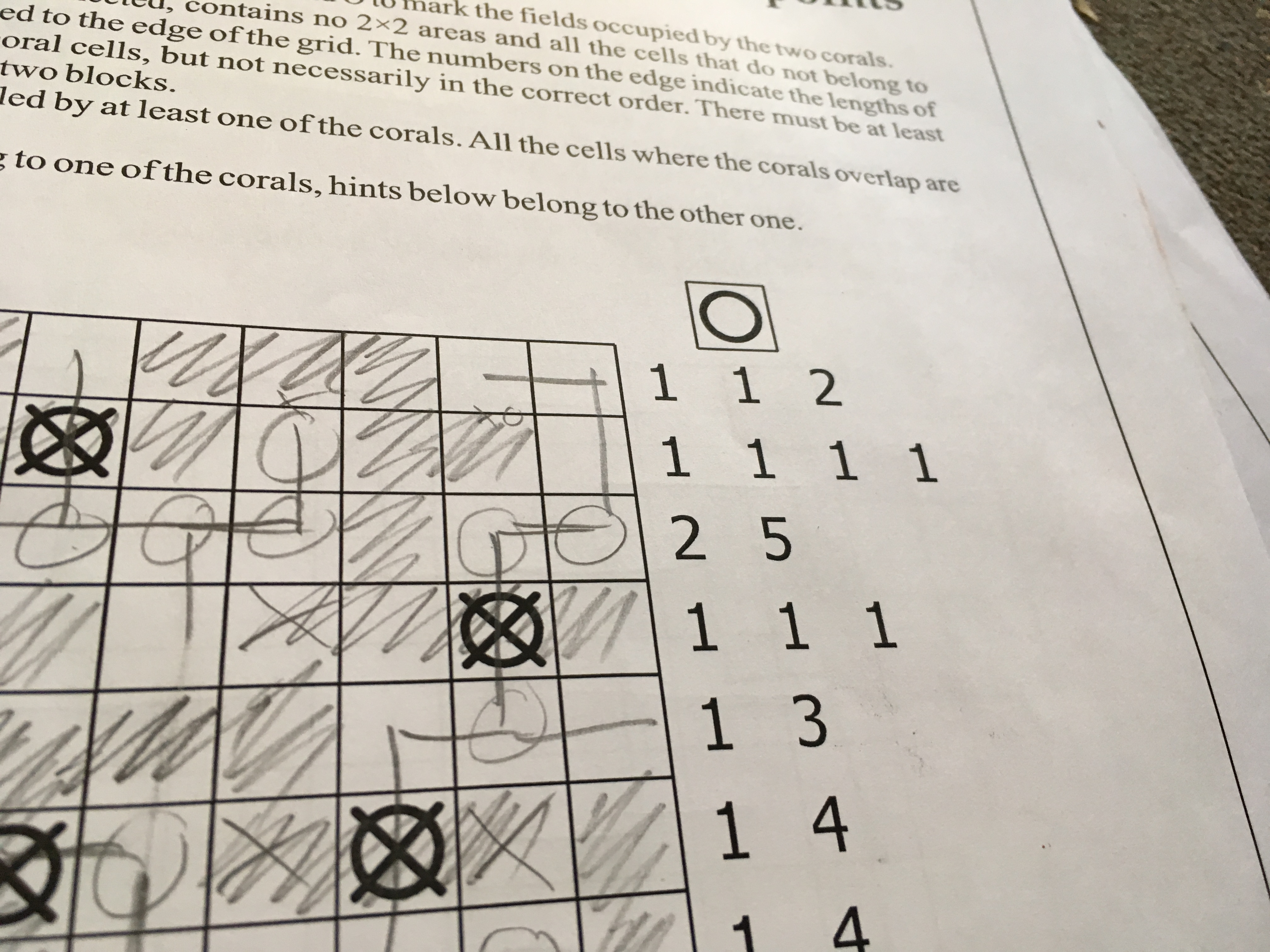 And the Double Shikaku kept me occupied for most of the rest of the round. After quite a bit of experimentation, I got to a convincing solution for one grid, but just couldn’t make the other grid work out. While I might have found the solution anyway, my core error here was missing another of the rule subtleties: It wasn’t just to distribute the clues between the two grids, but also to split each individual pair of adjacent clues. That was a sentence in the rules that I’d missed. It also explains why I gave up on Berni’s training puzzle of the type… Clearly one to chalk up to lack of preparation, but there’s also an element of instruction booklet carelessness here, since the example was uniquely solvable without that extra rule.