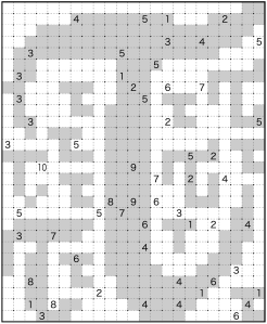 Rules Place numbers in the empty cells, from the range 0-9. Same numbers can’t be adjacent (but may touch by a corner). Wherever four cells meet at a vertex (marked by a black dot), the sum of the numbers in those cells must be 10.