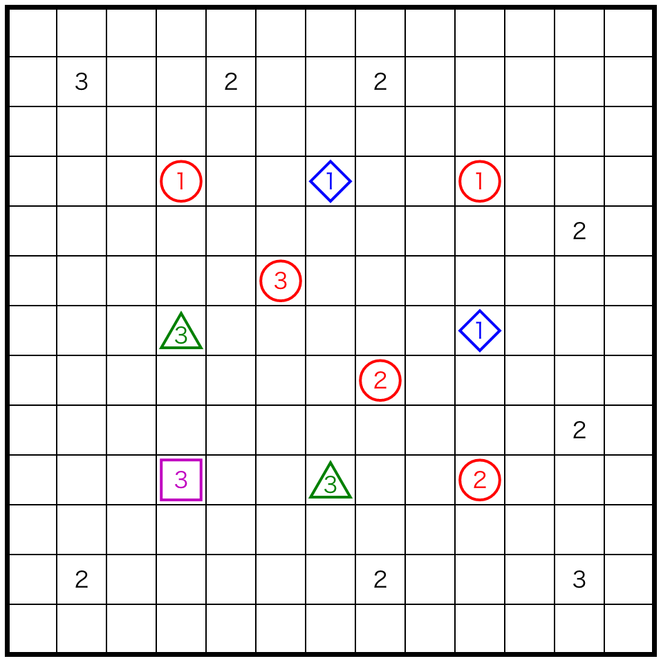 Rules Shade some cells to split the grid into edge-connected areas of unshaded cells (“countries”), one for each color ocurring among the clues of the puzzle. Clues are unshaded, and each country must contain all clues of the corresponding color. (Uncolored clues may belong to any of the countries.) Clue numbers count how many of the four adjacent cells are shaded. Furthermore, every shaded cell must be a border cell: it must have at least two unshaded cells that are part of different countries.