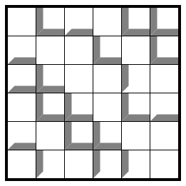 Rules Fill the grid with numbers from 1 to 6 such that every row and column contains all numbers. The numbers represent skyscrapers of the given height. There is a gray shadow at the south edge of a cell if some skyscraper further south in that column would throw a shadow onto the roof of the skyscraper in that cell, with the sun shining at a 45º angle. Similarly, a shadow on the west edge corresponds to sunshine from the west.