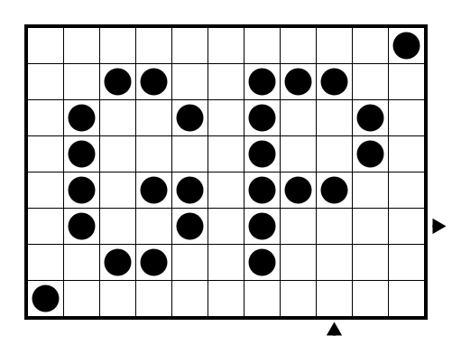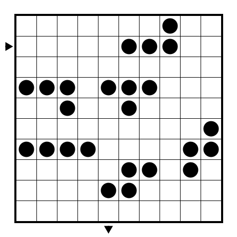 Rules Draw a path connecting the two arrows by shading some cells, such that all black circles are on the path, and such that no full two-by-two square of cells is used by the path.