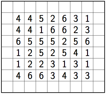 Rules Find the whole set of dominos with numbers 1 to 6 by dividing the grid into orthogonally connected areas with two digits each.