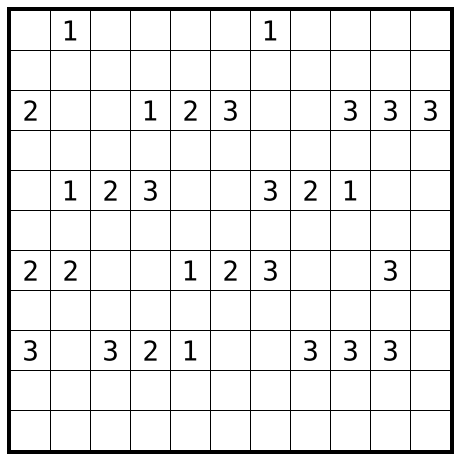 I should be writing up my experience in Kirchheim from two weeks ago, where I managed to beat Ulrich Voigt to take my first German title. Instead, here’s a Geradeweg puzzle, to serve as an advertisement for the Puzzler’s Club contest at LMI next weekend. The contest will feature two puzzles of mine (a Geradeweg and a Checkered Fillomino), next to a number of great puzzles by other authors.