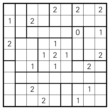 Rules Shade some cells, such that all unshaded cells are connected by edge, and that no two shaded cells share an edge. A horizontal or vertical stretch of unshaded cells may cross at most one area boundary. In addition, if there are any unshaded clues within an area, the number of shaded cells within that area must be equal to the sum of unshaded clues within that area.