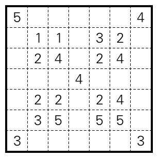There’s another easier puzzle of this type on the Rätselportal: Knapp daneben – Rechtecke. Then, in the knapp daneben instance of the Hausigel Contest Series. The double-clue Shikakus on croco should also be good practice: 2014-03-01, 2014-04-04.