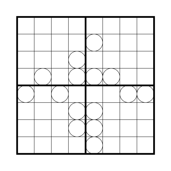 Rules Place numbers from 1 to 4 in each cell so that each row and column of each 4×4-block contains all numbers 1 to 4. Circled numbers are valid skyscraper clues for the adjacent grid (for both adjacent grids in the central corners). Uncircled numbers are not valid skyscraper clues for the adjacent grid (for neither adjacent grid in the central corners).