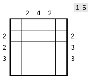 Rules Fill each row and column with numbers from 1 through 5 as well as a single diagonal mirror. Clues act as regular skyscraper clues, but follow the mirrors.
