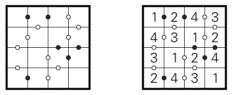 Fill the cells with numbers from 1 to <i>n</i>, where <i>n</i> is the size of the grid, such that each row and column contains each number exactly once. If an edge between cells is marked with a white dot, the difference of the two adjacent numbers is 1. If it is marked with a black dot, one number is double the other number. If there is no mark, neither of these conditions apply.