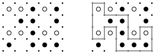 Draw a single loop consisting of vertical and horizontal segments between dots that does not touch or cross itself. For each cell, this loop visits a certain number of corners and edges. If there is a black dot in a cell, one of these numbers is equal to the other number multiplied by two. If there is a white dot in a cell, the two numbers are consecutive. If there is no dot in a cell, neither of these conditions applies.